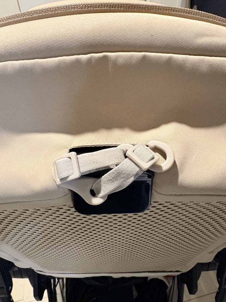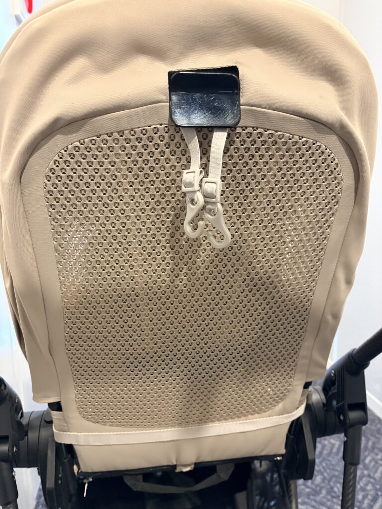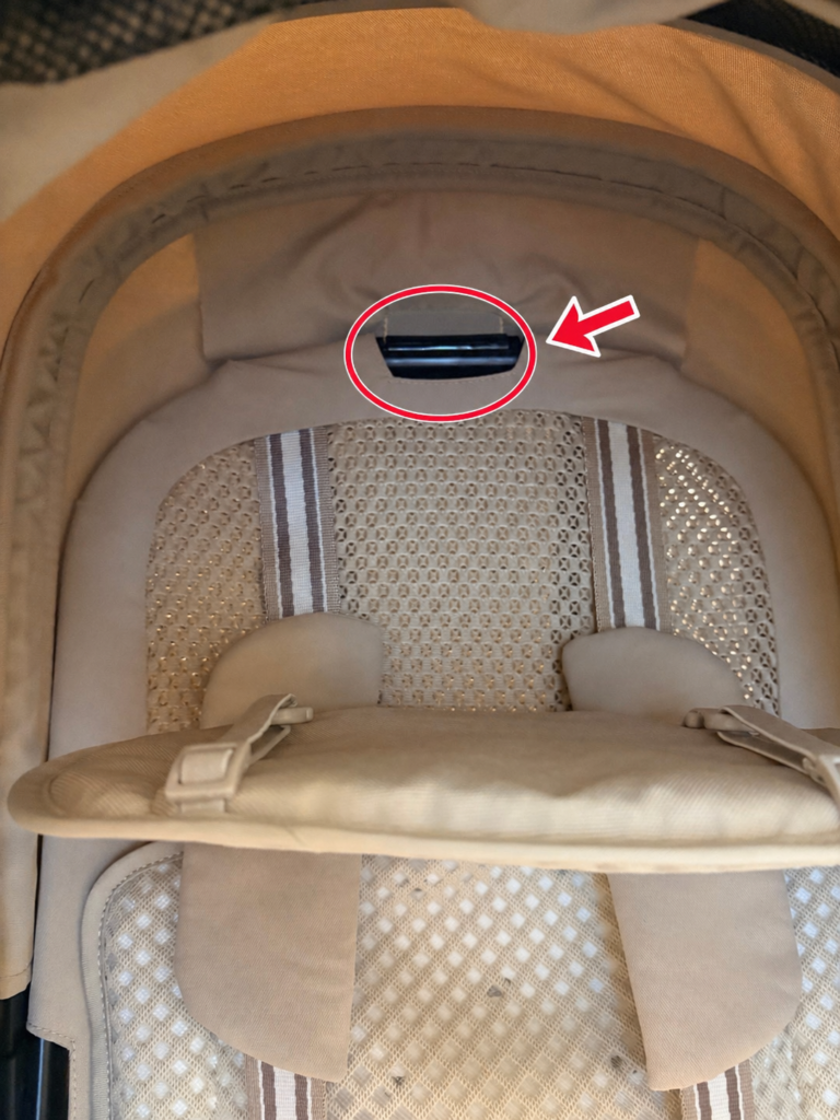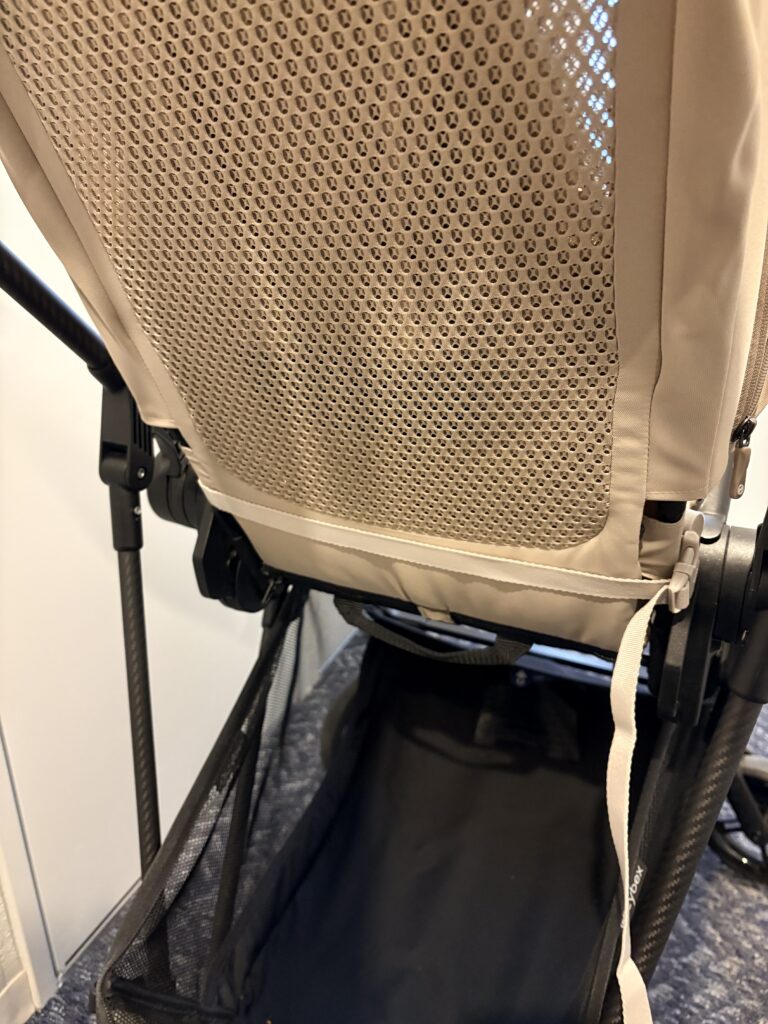 次に、左右のベルトをベビーカーの背面に回します。