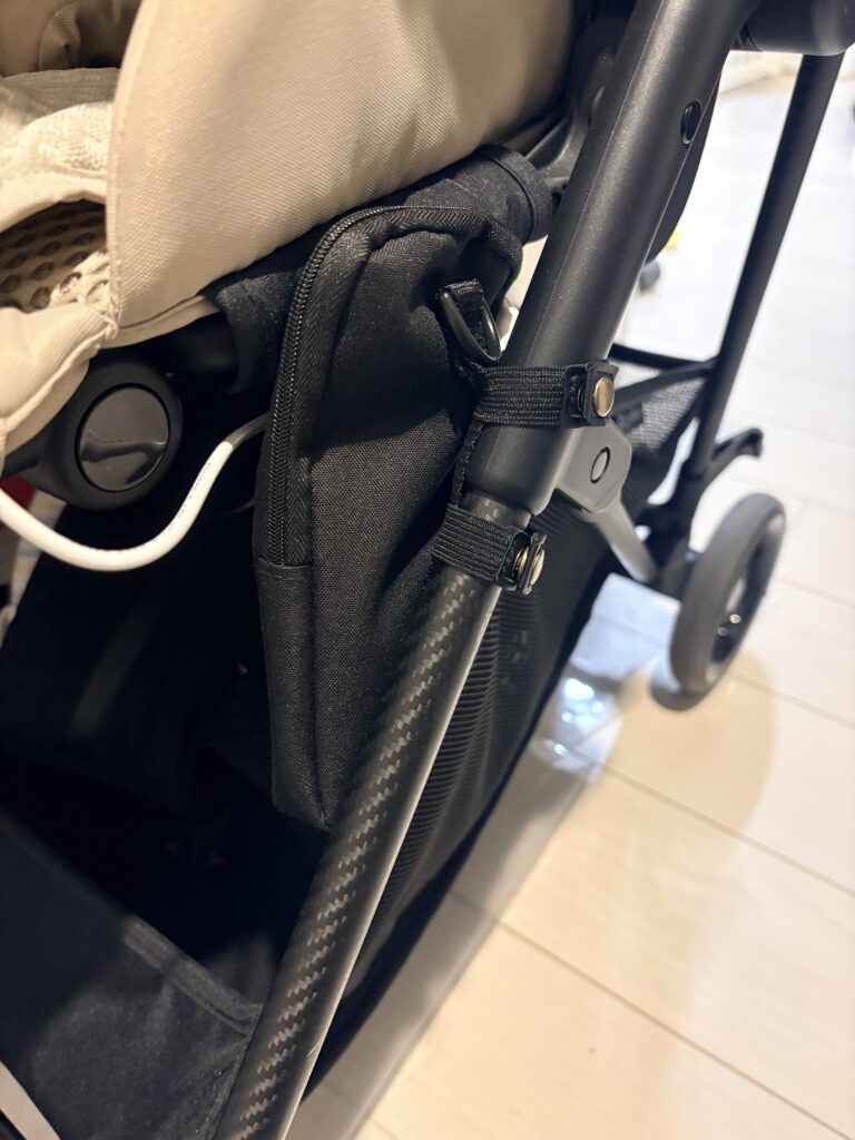ベビーカーのフレームに取り付けたらこんな感じ。